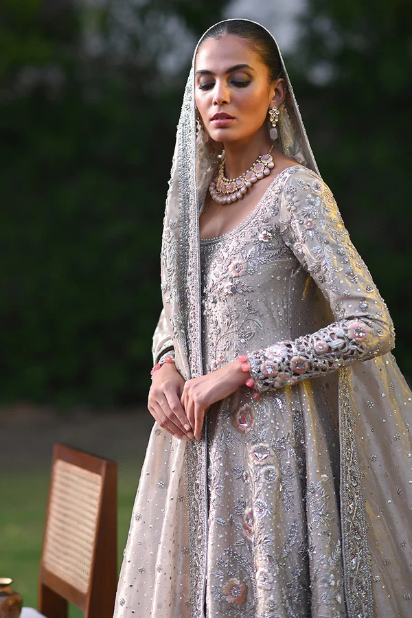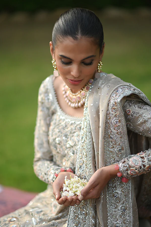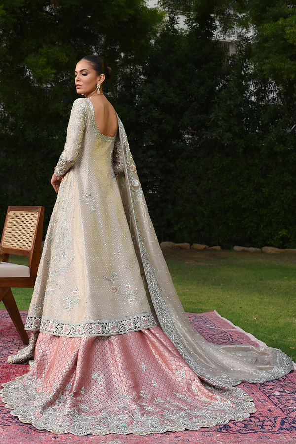 This metallic silver bridal is breathtakingly elegant. Cut from the finest tissue, this long peshwas has silver zardoze, rose embroidered flowers and cutworked detailing on the sleeves and hemline. The tissue Dupatta is heavily embellished and dispersed with chan and finished with a worked border edging. The rosy pink brocade farshi lehnga trails behind with a scalloped cutworked border, paying ode to exquisite craftsmanship.