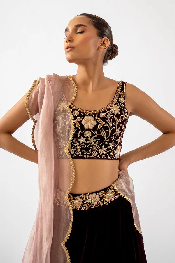 This deep mahogany lehnga choli set is cut from plush velvet and is rendered with intricate zardoze work, embodying a graceful and festive look. A pink zari net dupatta with worked scalloped borders brings the look together.