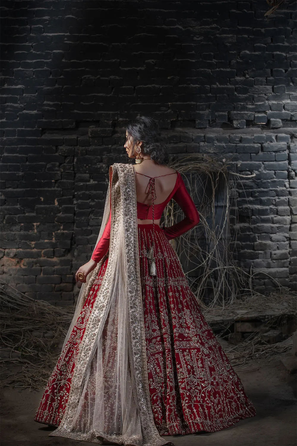 Fully embellished deep red lehenga made of velvet with mirror, sequin, zardozi, and thread work. With a mix of geometric and floral patterns, the lehenga is paired with a plain red silk choli along with a nude pink dupatta. The net dupatta has heavily embellished borders on all four sides.