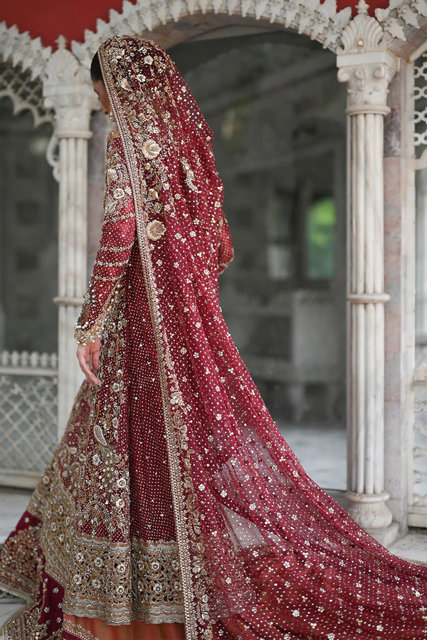 This off shoulder crimson net peshwas bridal ensemble is a dream-worthy ode to all that is romantic and ethereal. Shades of reds and gold sparkle through zardoze, sequin and crystal work. The brocade farshi lehnga speaks to times bygone with the complementing tangerine shade pattern and worked border. The heavily worked net dupatta has big embellished birds that completes the bridal ensemble to perfection.