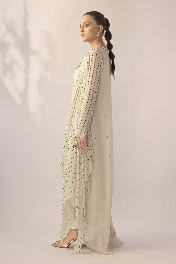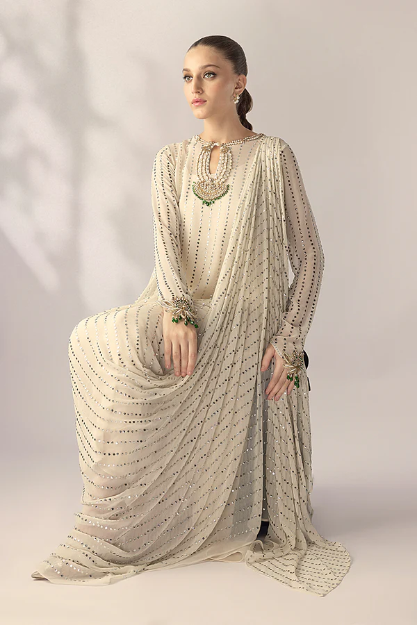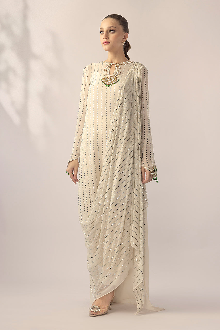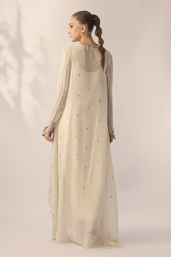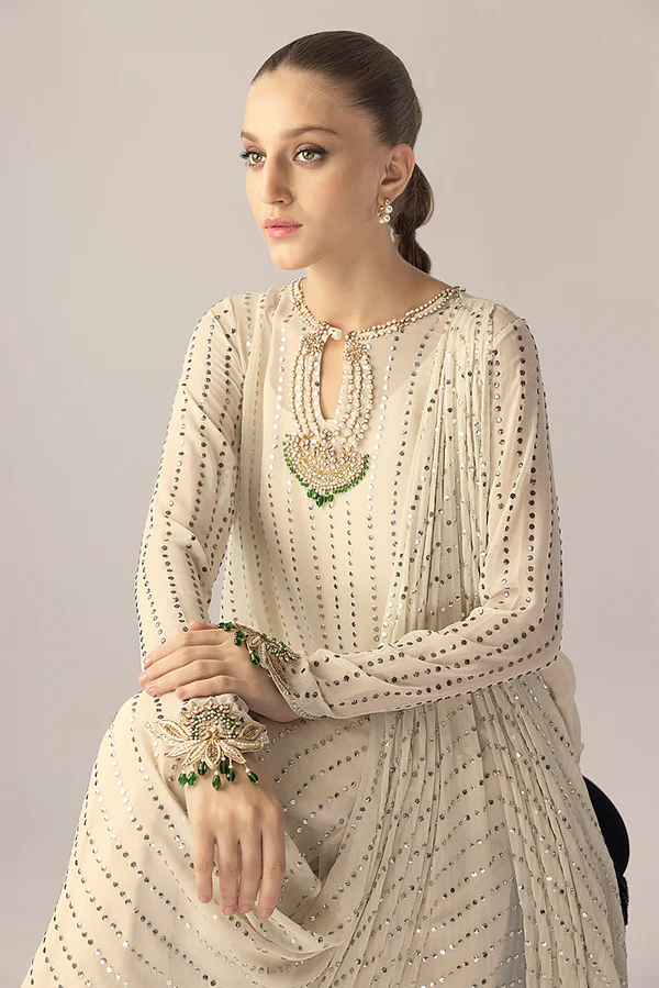 An ivory georgette long shirt with a draped dupatta is handworked with delicate kamdani. The sleeves and neckline are detailed with jewelled floral motifs. An elegant ensemble for any formal event or soiree.