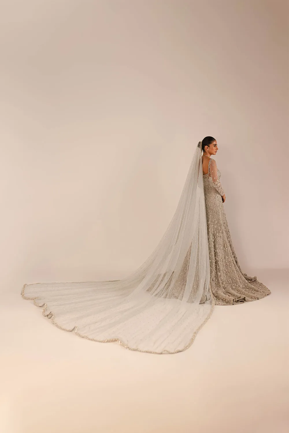 This ice-blue bridal gown features a sheer net bodice, a cinched waist and a floor length skirt with a train. This bridal is embellished all over with crystals, pearls, sequins and thread-work. A trailing veil completes the look, subtly adorned with line work and florals. Flared Gown: NetVeil: net