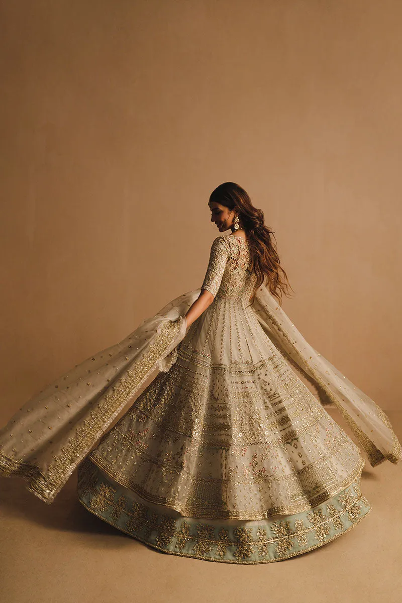 Flared white net pishwas with heavily embellished linear and geometric patterns enhanced by pastel embroidery and zardozi work. Paired with a fully flared net lehenga with an intricate border. The organza net dupatta has heavily embellished borders on all four sides with pearl and motif spray in the middle.
