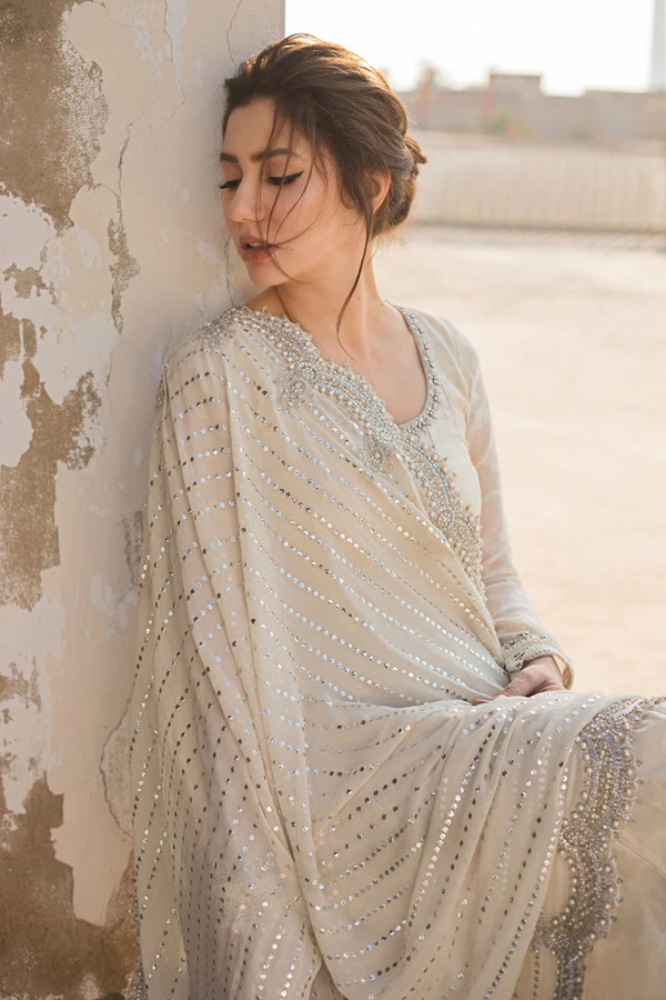 An elegant kalidaar peshwaas in a beautiful creme hue work details along the neckline and sleeves and ruffle details along the hemline A georgette kamdaani dupatta with detailed scalloped worked borders completed the look A timeless handcrafted heirloom