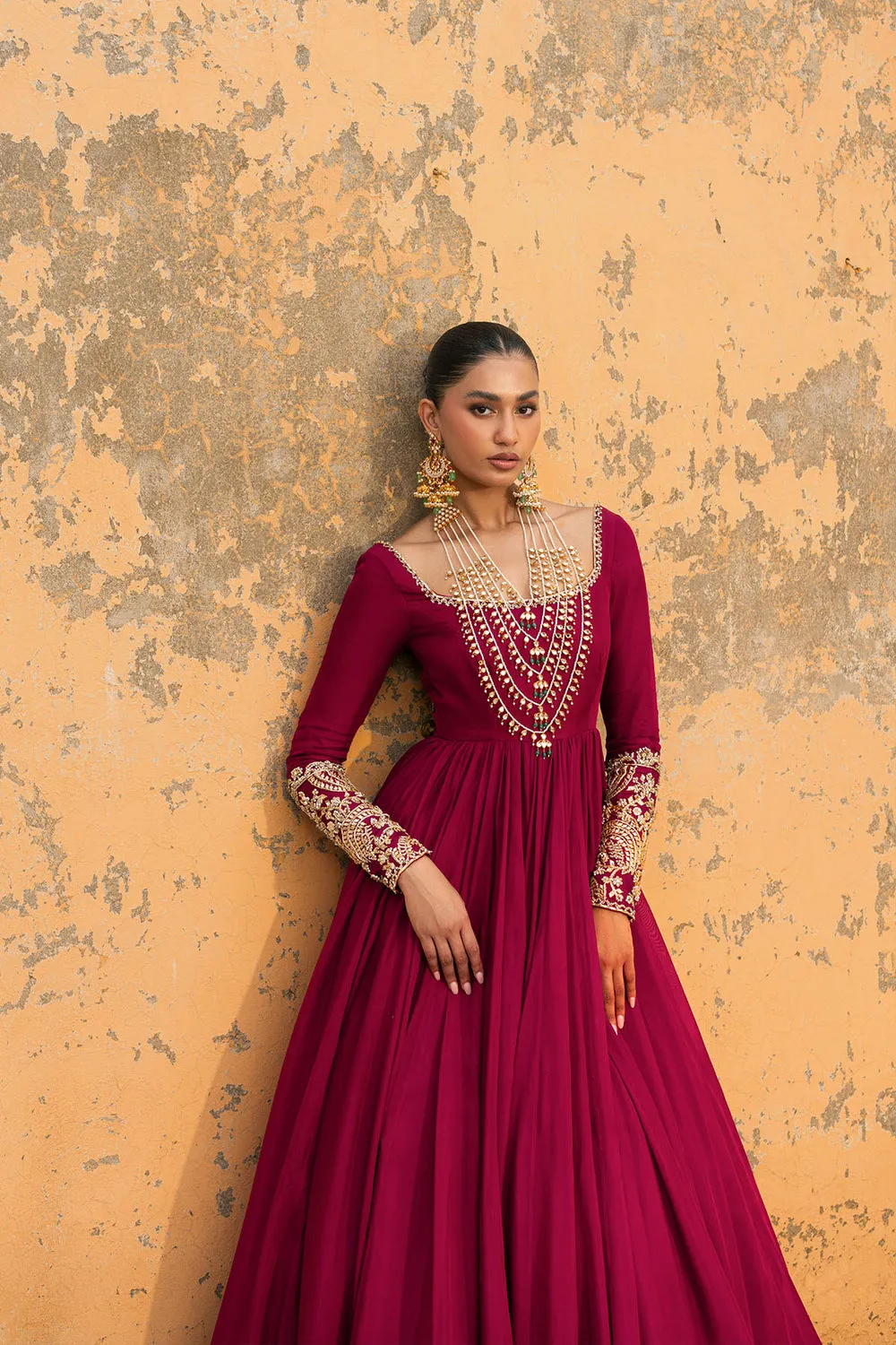 A large-flared Marsala red peshwas paired with an embroidered organza lehenga. The peshwas features zardozi work adorning the neckline and sleeves. The ensemble is completed with a silk chiffon dupatta, accented with delicate metallic borders.Peshwas : Silk ChiffonLehnga : OrganzaDupatta : Silk ChiffonModel Height 5.8