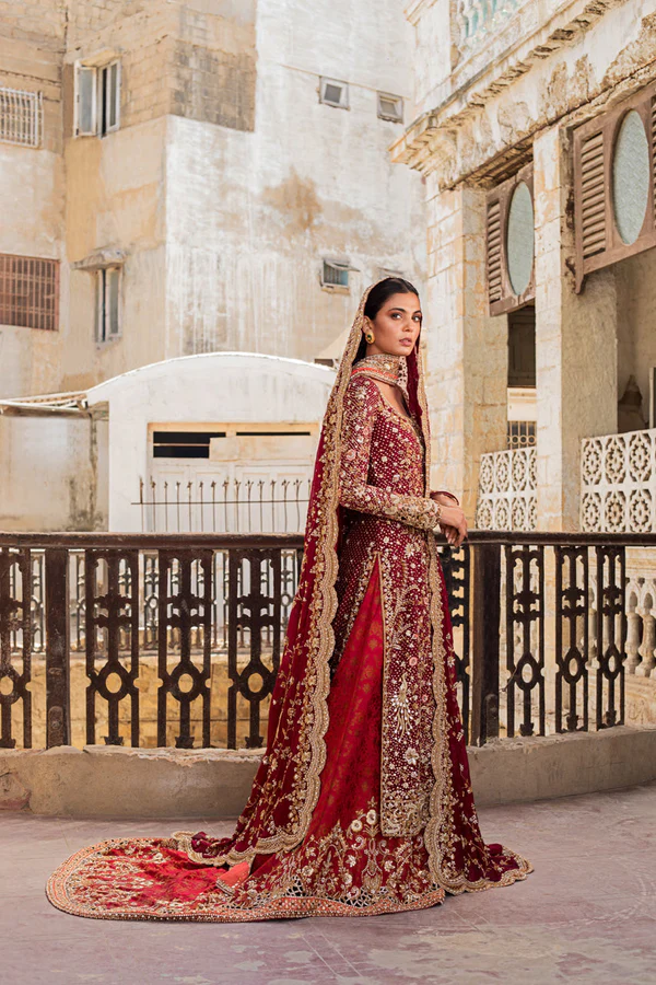 A timeless elegance that is eternal a soft cotton net shirt in garnet is intricately embellished with zardoze kamdaani and resham paired with a traditional farshi gharara in crimson hues with our signature cutwork that frames the border and a matching cotton net dupatta decorated with a scalloped border and floral sprigs in zardoze complete this regal bridal look with a second dupatta in a beautiful shade of coral detailed with kamdaani and worked borders.