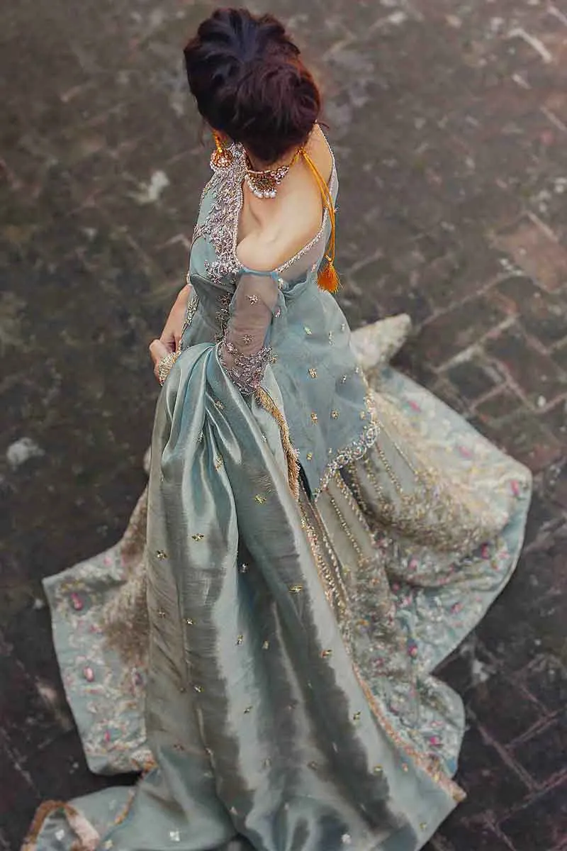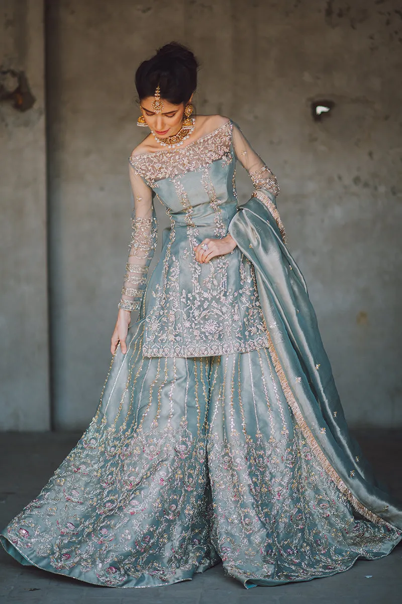 Ice blue gota and zardozi tissue sharara; heavily hand-embroidered and embellished at the hem with a pattern reducing in size and converting into gota and zardozi lines up towards the waist. Intricately embellished net shirt with pastel hues of threads and zardozi on the hem and all over. Paired with an ice blue tissue dupatta with gota and zardozi motif spray and gold fringe finishing.Shirt: Net Sharara: TissueDupatta: Tissue