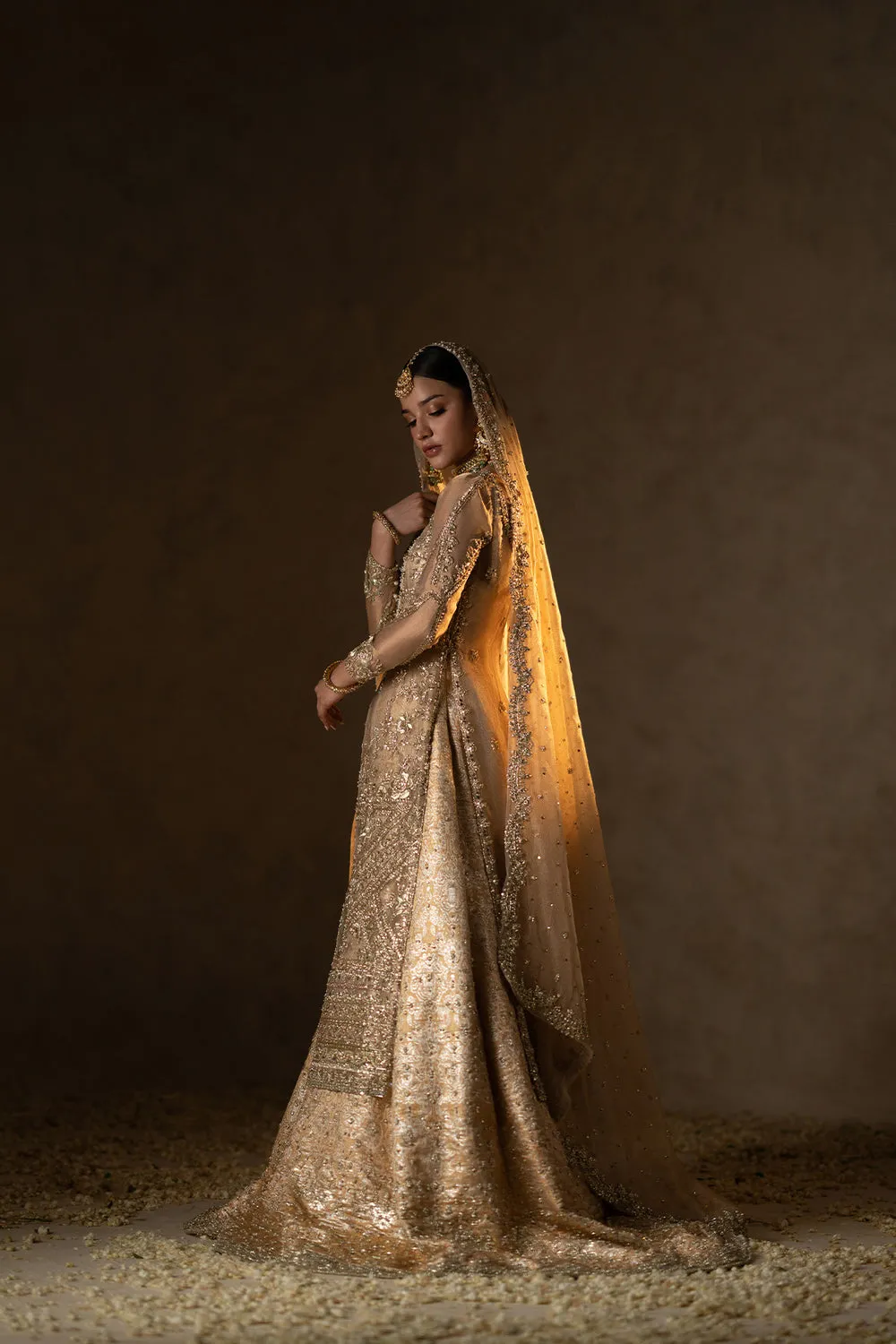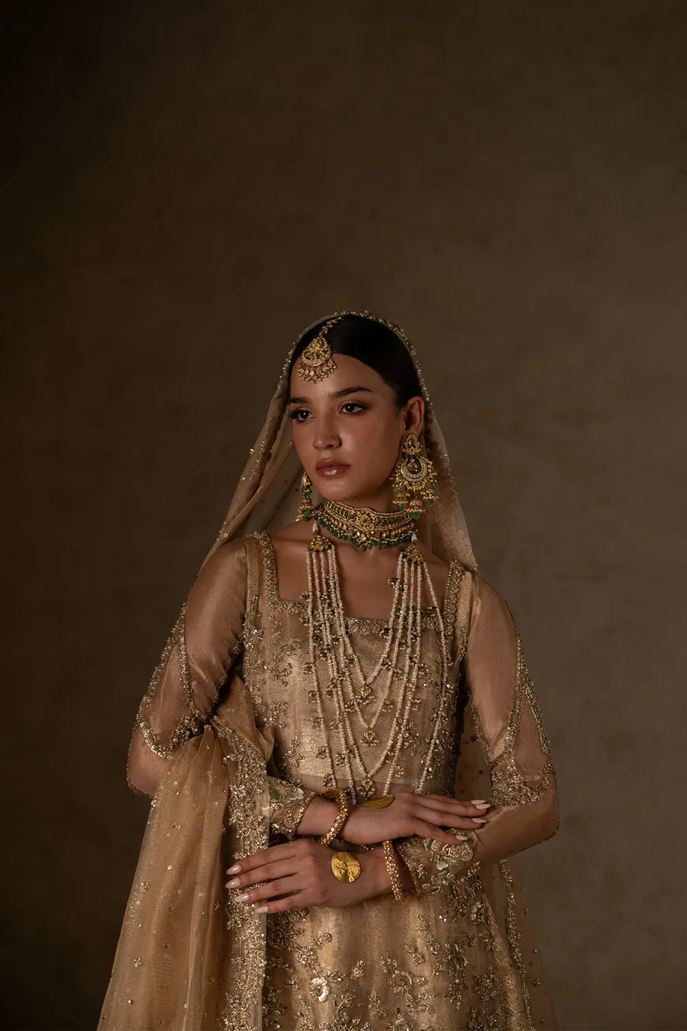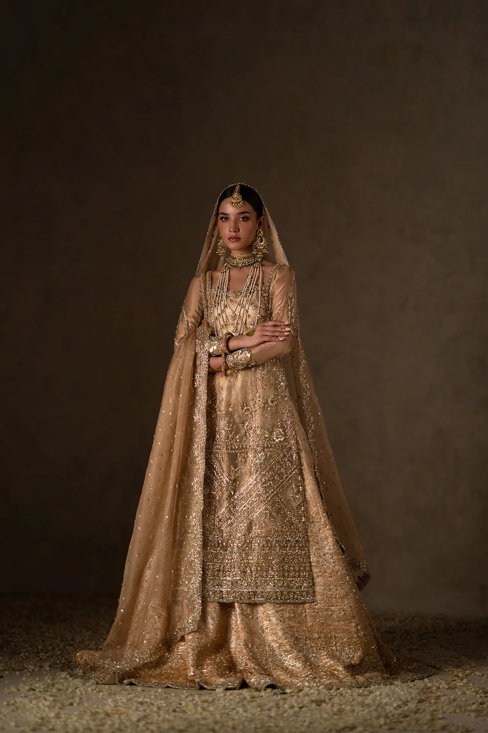 The outfit features a gold tissue shirt, beautifully embellished with geometric and floral designs. It is paired with a silk brocade sharara, adorned with zardozi and sequin work, and finished with detailed decorative borders. A scalloped dupatta, richly detailed with elaborate motifs and sequin sprays, completes the ensemble.Shirt: Indian Tissue Sharara: Silk Brocade Dupatta: Zari Net