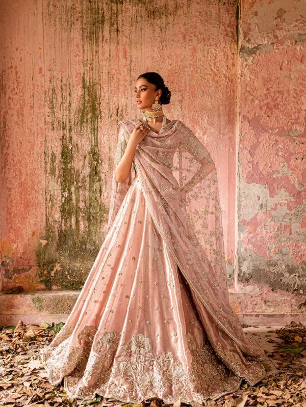 A whisper of rose gold tissue, this ethereal peshwas glimmers with silver zardoze, sequins, and crystal accents. The bodice, sculpted with elbow length sleeves and delicate cutwork embroidery, flows into a flared silhouette adorned with floral sprigs and a scalloped embroidered hemline. A diaphanous tissue dupatta, edged with scalloped zardoze borders, frames the look, while a voluminous brocade lehnga finished with softly ruffled hems lends an air of timeless opulence.Model height: 5’7Cut: Slim Fit