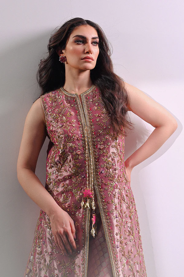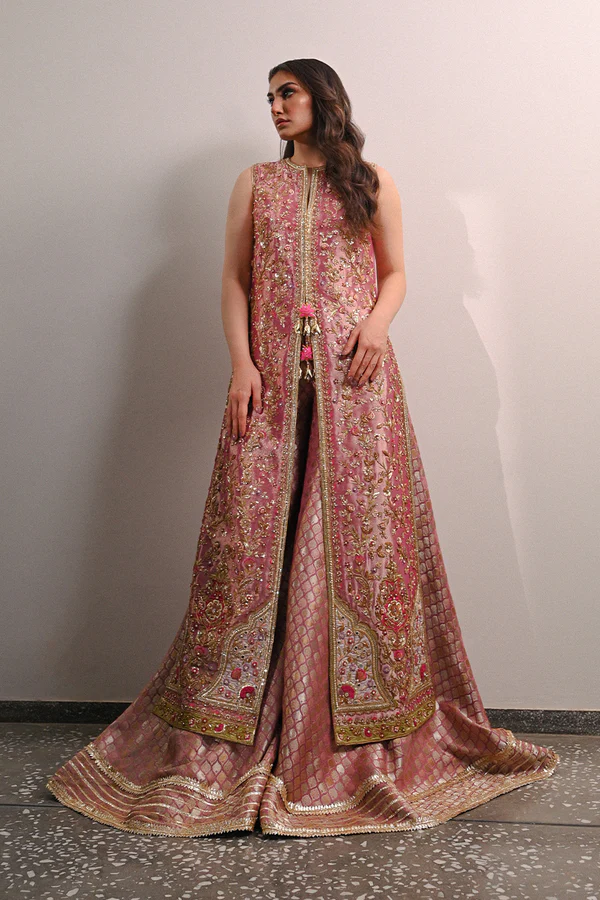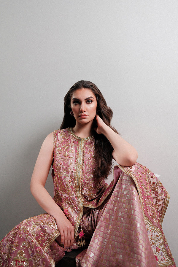 Amani embraces the earnest allure of a classically feminine straight cut, front open jacket with a dramatically high slit in the middle. The deep rose gold tissue is artfully emblazoned with elegant resham floral sprigs, in contrasting hues, accentuated with zardoze details. The rose gold brocade dhaka pajama, with gota details, complements the appliqued hem of the iridescent attire.Model height: 5’3Length: 53″Cut: Slim FitIn this price range, the maximum length is 53″. Please note that the shirt length cannot exceed the maximum length.