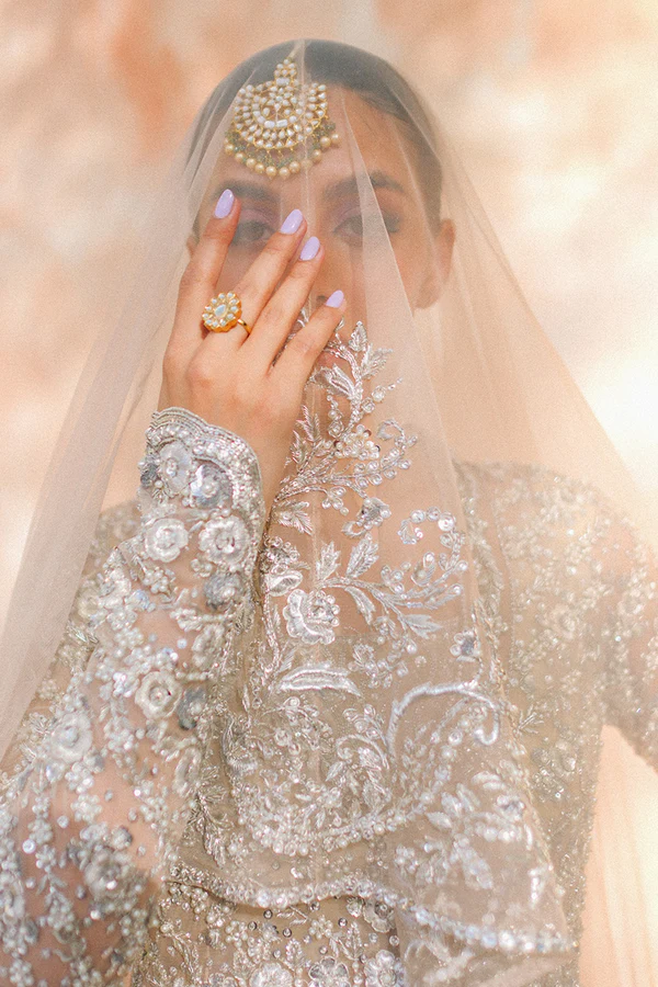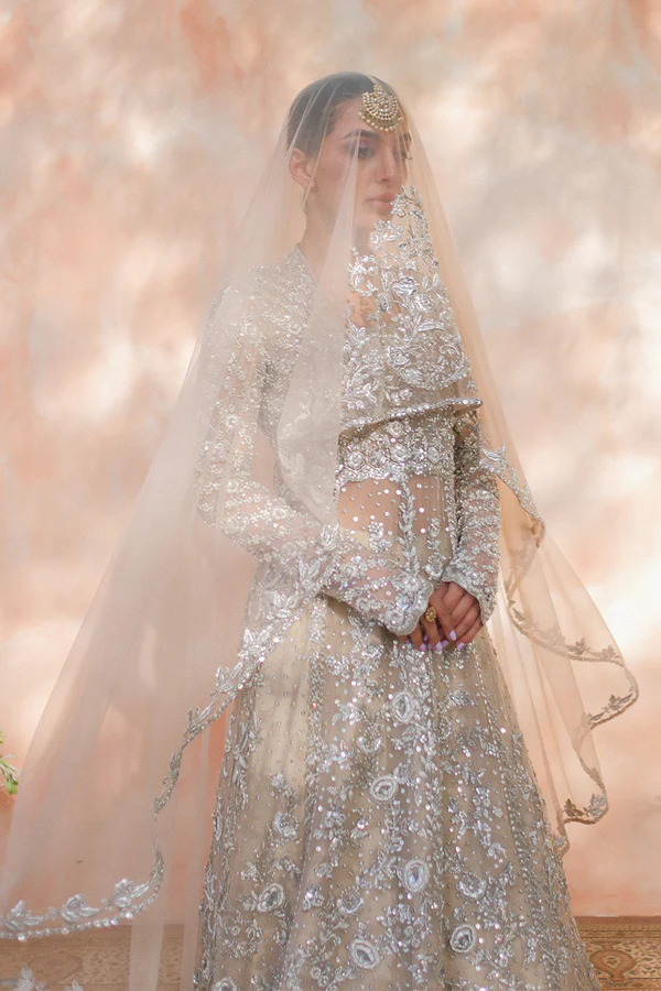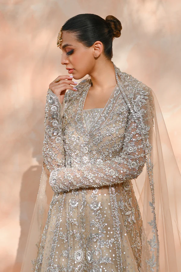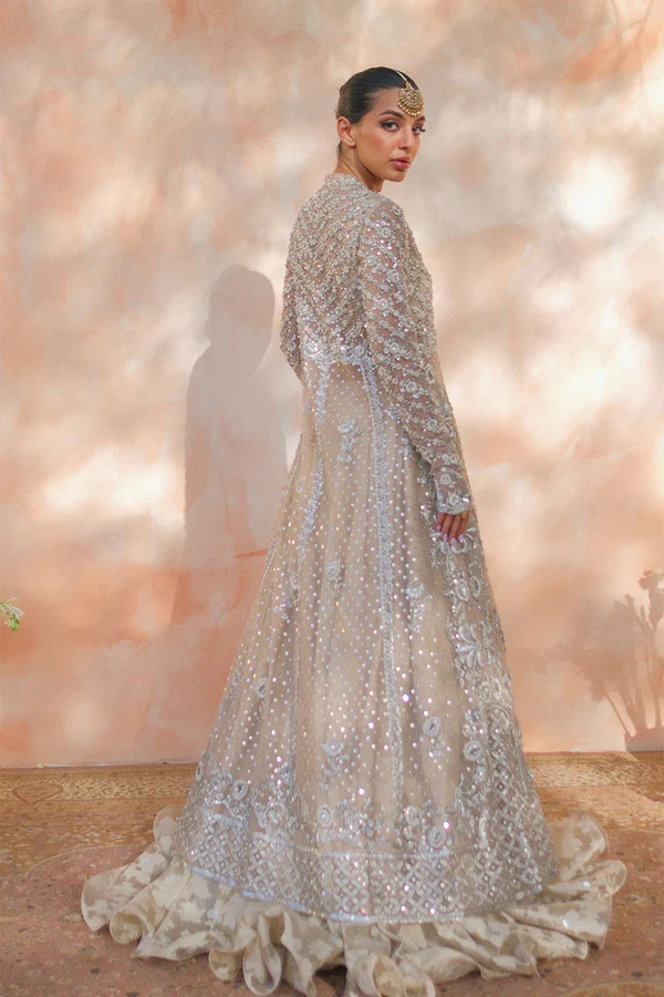 “An ethereal bone coloured tulle peshwas is intricately rendered with floral zardoze and resham work; and paired with a matching tulle veil. The timeless look is completed with a ruffled brocade lehnga adorned with dispersed gota flowers.