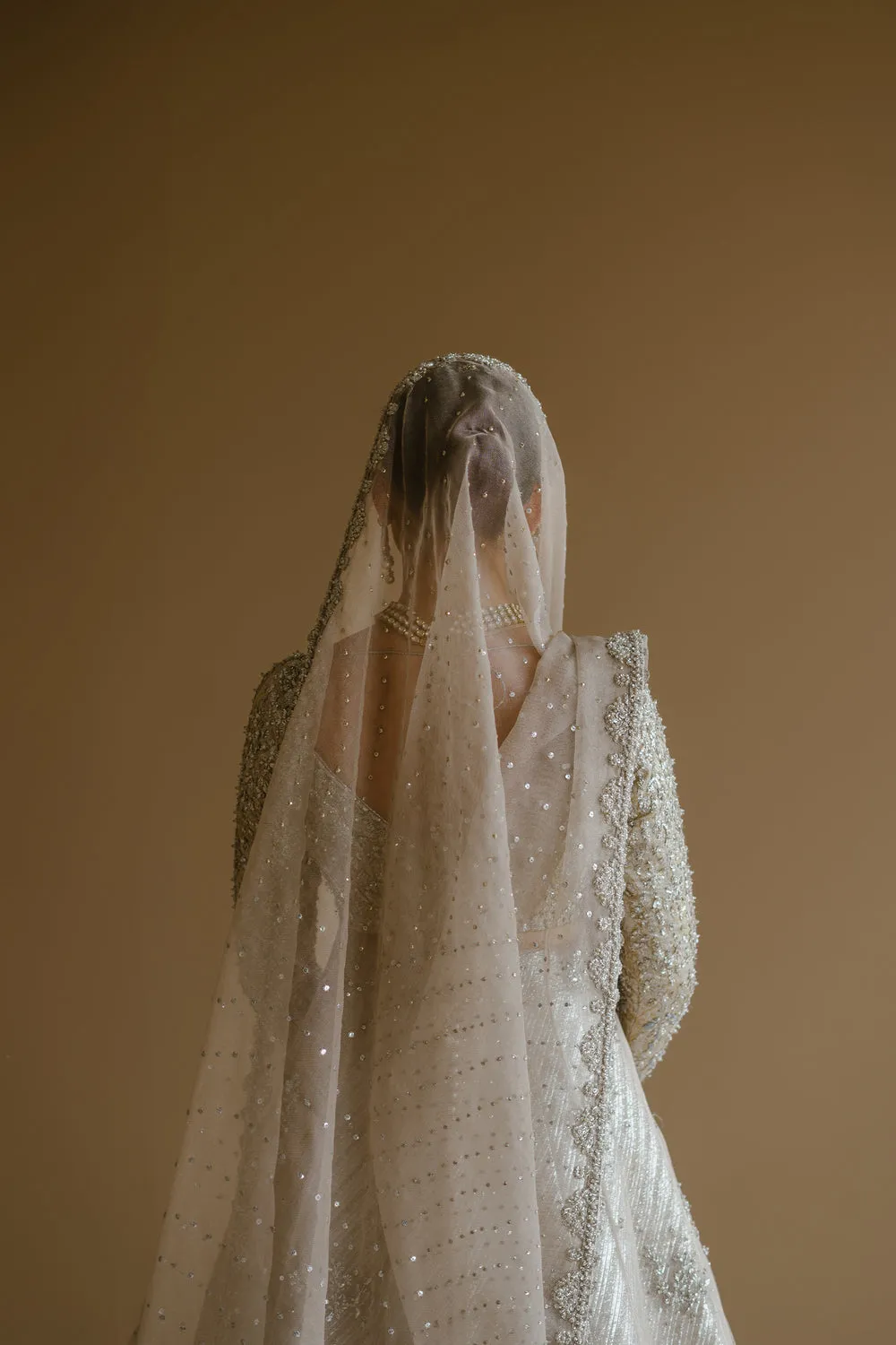 The ivory gold body is accentuated with silver Zardozi work and intricate neck detailing. The attire is completed with a Zari net dupatta, featuring embellished borders and a heavy spray.