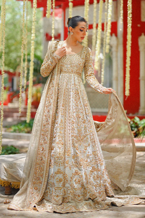 “Exude elegance in this metallic silver hued peshwas cut from tissue, featuring a scalloped hem and detailed zardoze work in a silver and gold composition. A tissue dupatta with sprinkled sequins and zardoze worked borders is paired with a matching handworked tissue brocade lehnga.”
