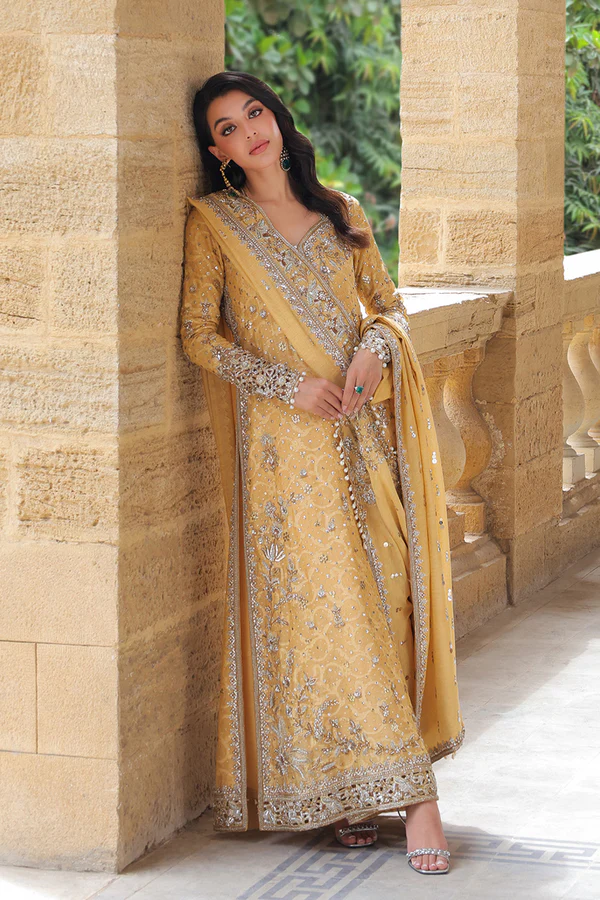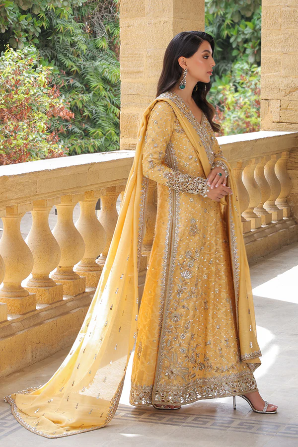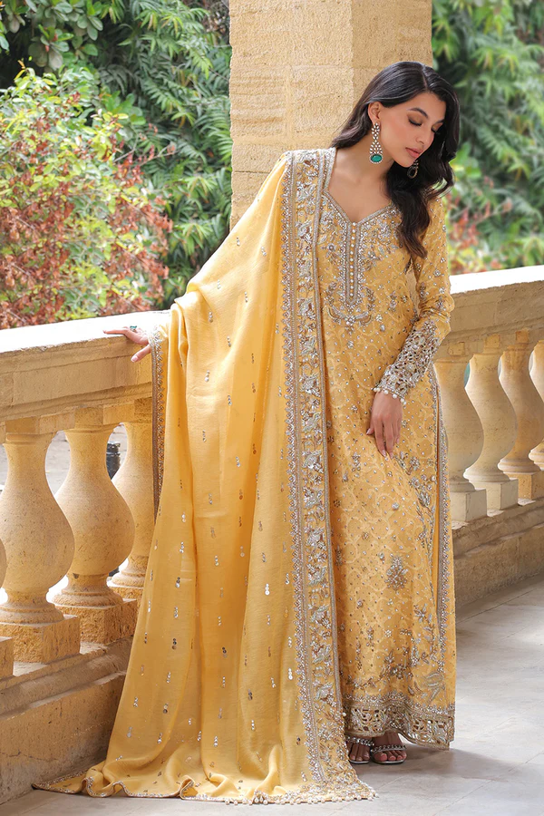 A flowing A-line column shirt in luminous saffron self-embossed cotton net, drenched in silver zardoze, gota, resham, and sequins, channels heirloom romance with modern poise. Scalloped borders richly frame the sleeves and hemline, adding textural depth. Paired with a tonal cotton net dupatta, its ornate embroidered frame and scattered sequins catch the light, while embroidered pure rawsilk izaar in the same sunlit hue ground the look in timeless elegance.Model height: 5’5Cut: Slim Fit