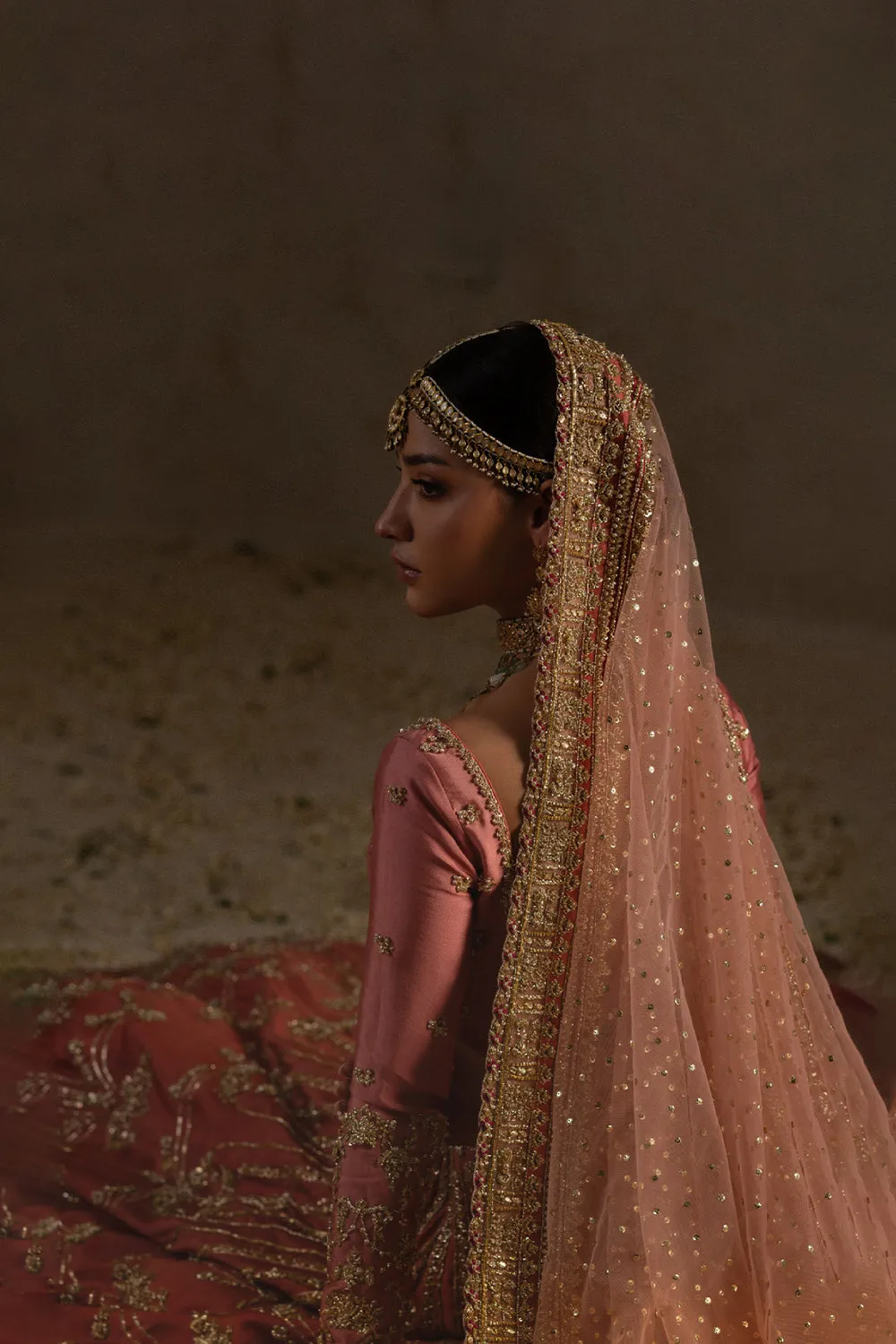 A warm coral bridal lehenga paired with a contrasting pink choli, featuring heavily embellished cuffs and motif sprays. The lehenga is adorned with intricate floral borders, scalloped and linear detailing, all enhanced with zardozi and gota accents. Completing the look is a pastel pink net dupatta with delicate scalloped borders and a heavy sequin spray.Choli and Lehnga: Tissue Raw silk Dupatta : Net