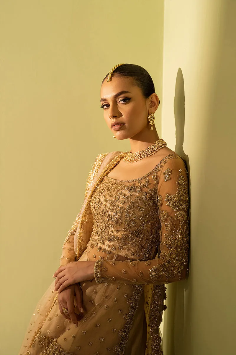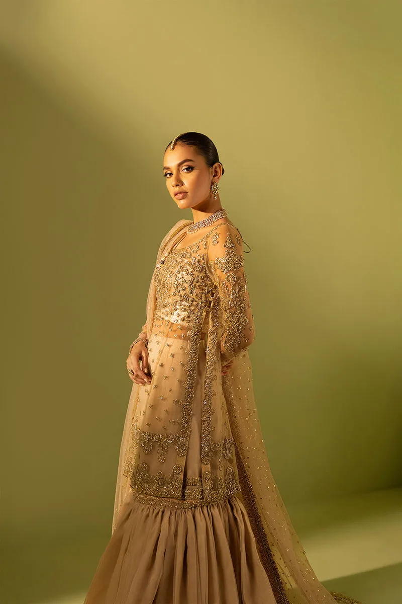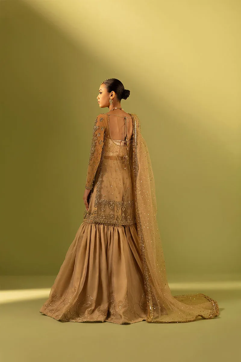 A nude pink organza shirt richly embellished with zardozi, sequin, and pearl work. The gharara is embellished with heavier detailing around the knee and oversized floral pattern embellishments around the hem. The look is completed with a net dupatta featuring embellished borders and a heavy motif spray with kiran finishing.