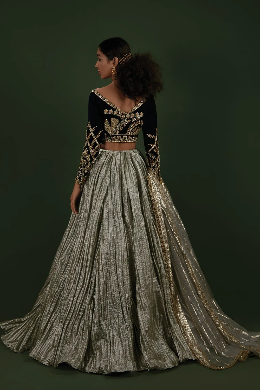 Choli made of teal-colored velvet, embellished with intricate floral and geometric patterns with subtle accents of pastel threadwork. Paired with a mint-ice blue crushed lehenga made of shimmered fabric and an organza zari dupatta.Choli: VelvetLehenga: TissueDupatta: Organza Zari
