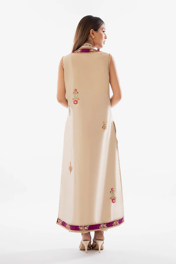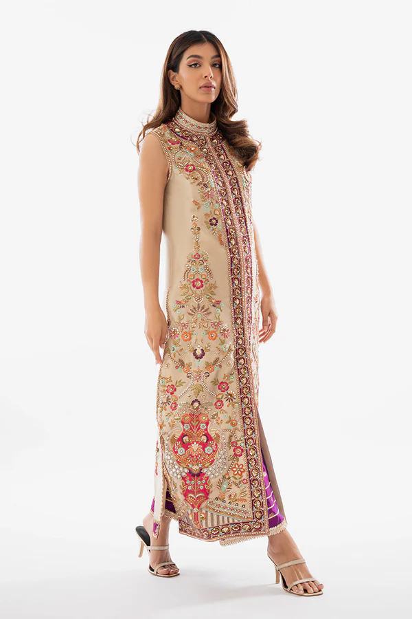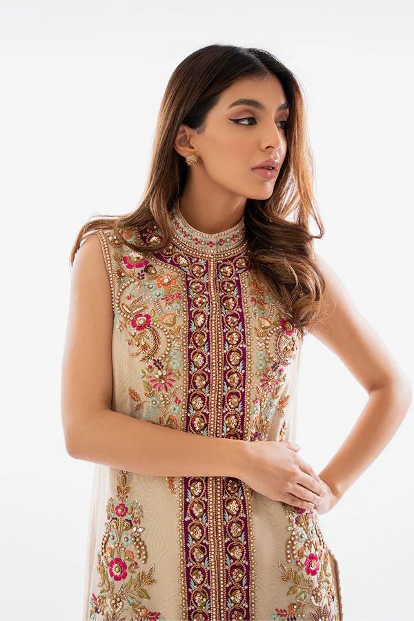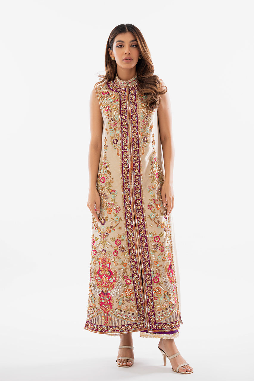 This pale gold tissue jacket is artfully rendered with zardoze and chatapatti work. The front open jacket is paired with a brocade izaar finished with gota.