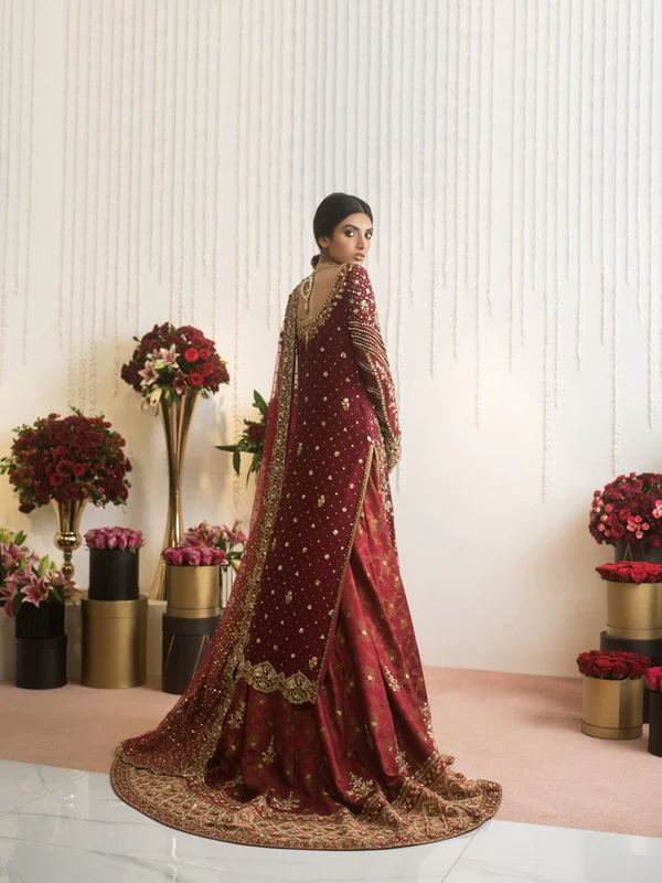 An elegance that is eternal we introduce our classic maroon bridal steeped in tradition this look blends mild modernity with an allure of the east A cotton net shirt paired with a beautiful banarsi lehnga with coral borders a tulle dupatta enriched with embellished details complete this bridal ensemble
