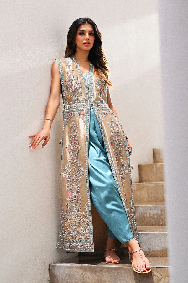 Orchestrating an interplay of exquisite workmanship of zardoze and hints of resham, Suri is a quintessential champagne gold column jacket, cut from tissue. A celadon hued, charmeuse, draped shalwar and tube top adds effortlessness to an otherwise glamorous look.Model height: 5’5LENGTH: 52Cut: Slim fit