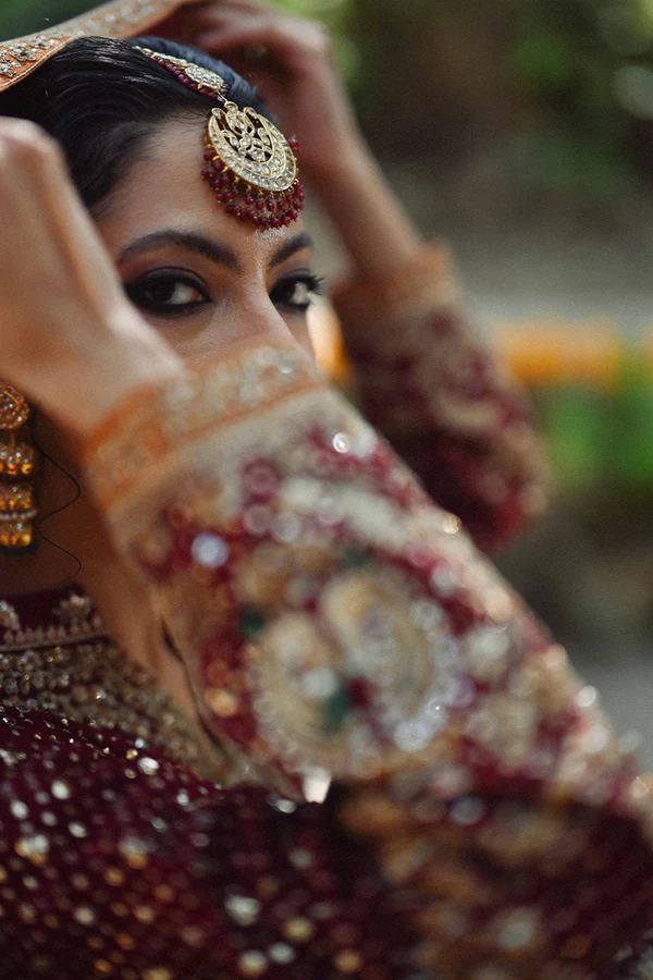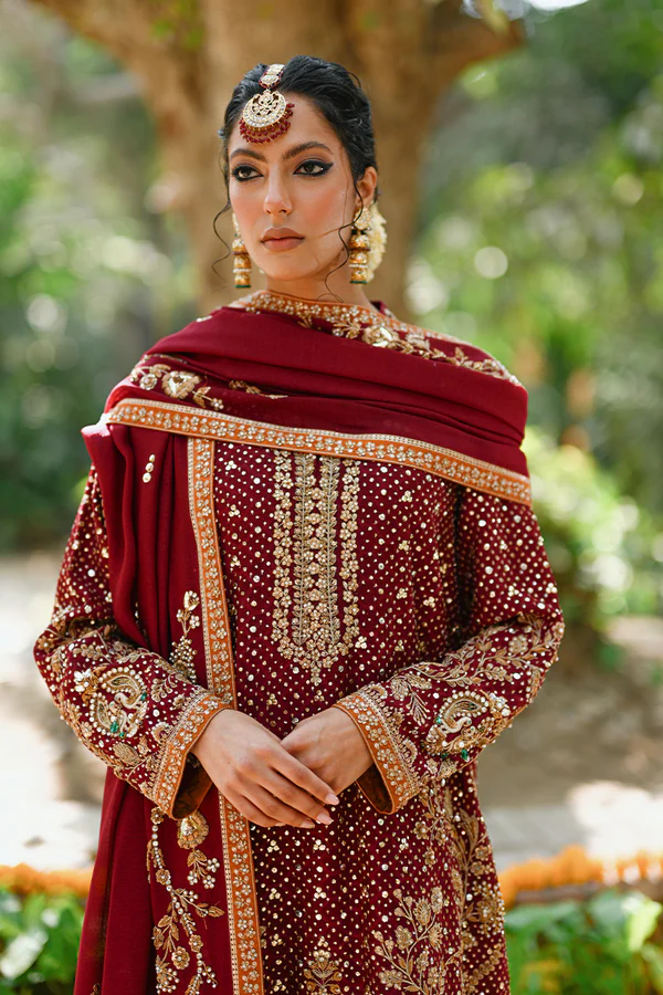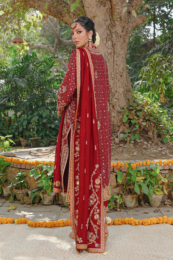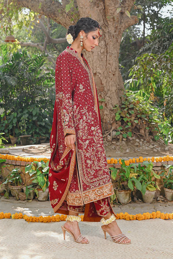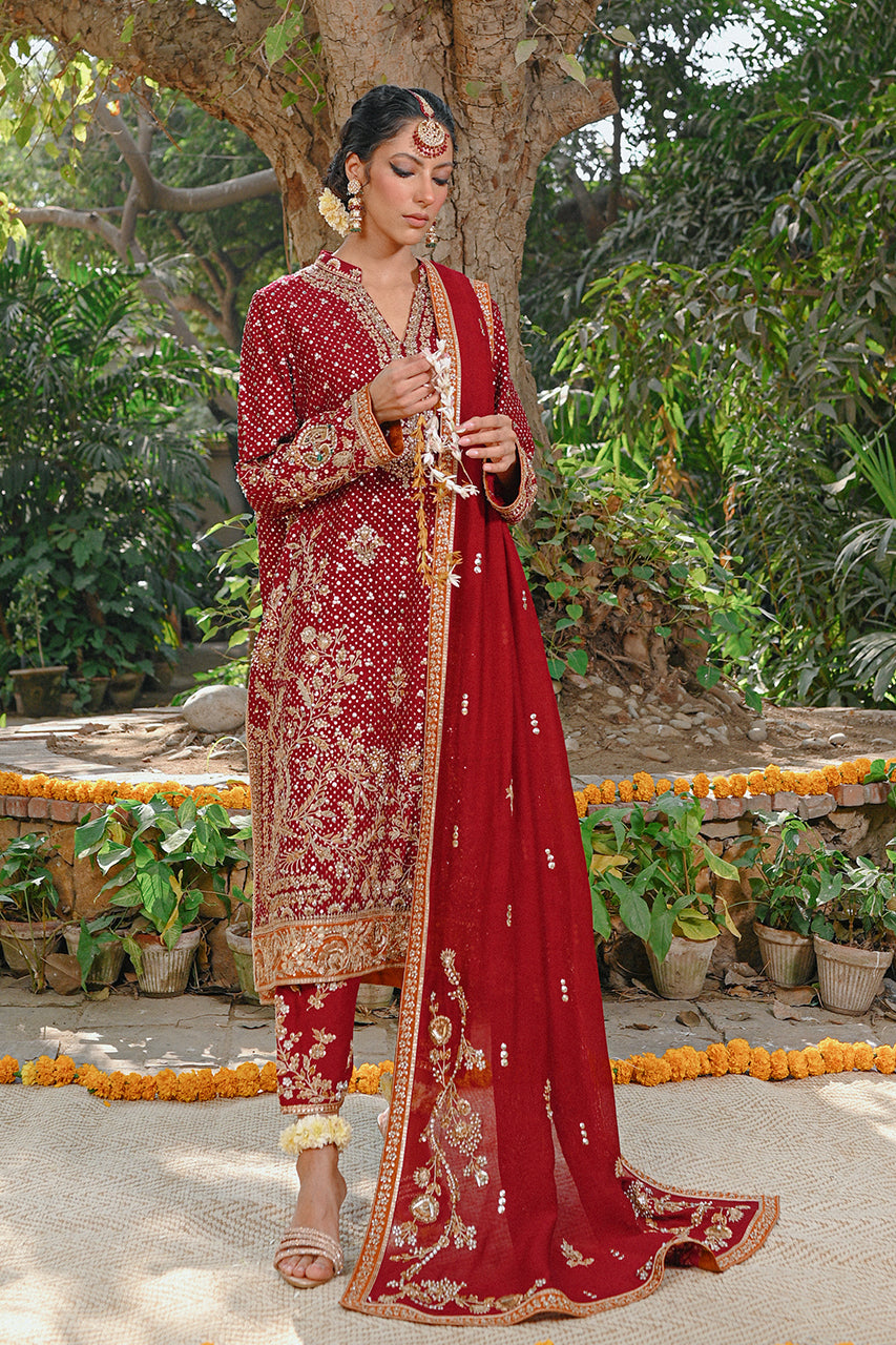 In a deep shade of crimson, this cotton net shirt is both festive and elegant. The shirt is heavily embellished with zardoze, kamdani and floral embroidery. The crimson raw silk shalwar is touched with gota and floral embroidery. The piece is paired with a matching cotton net kamdani dupatta with embroidered floral motifs.