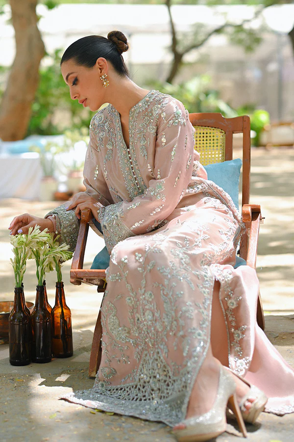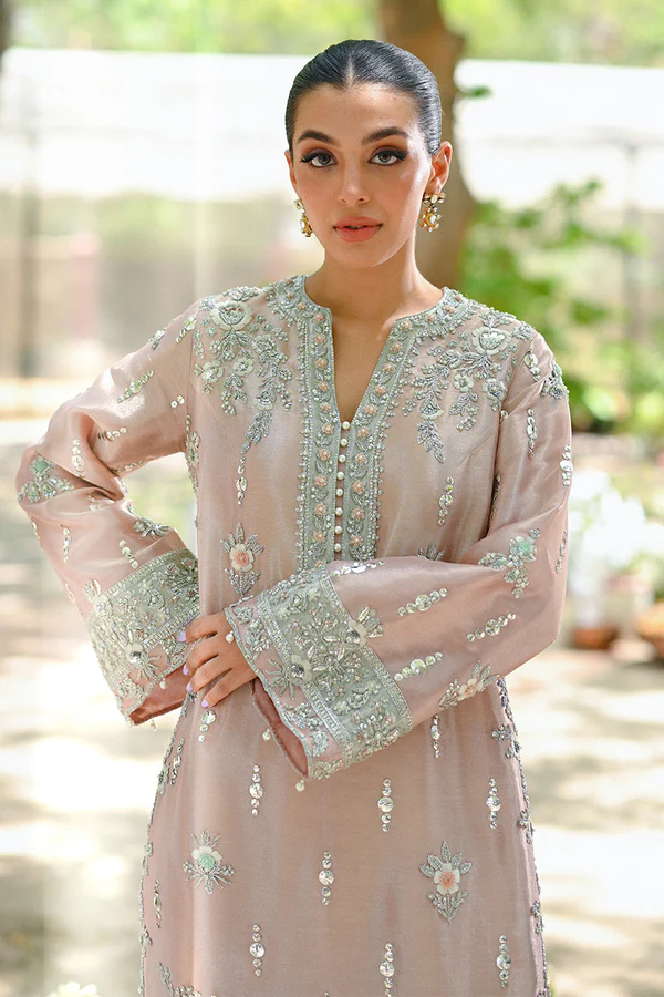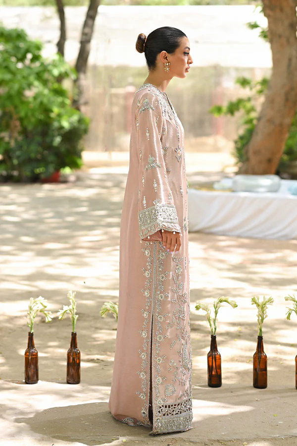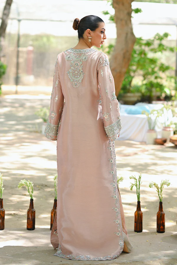 “A contemporary take on a classic kaftan silhouette, cut from tissue, in an elegant shade of blush pink. Dispersed kamdani and zardoze details with a cutworked hem elevate the look.”