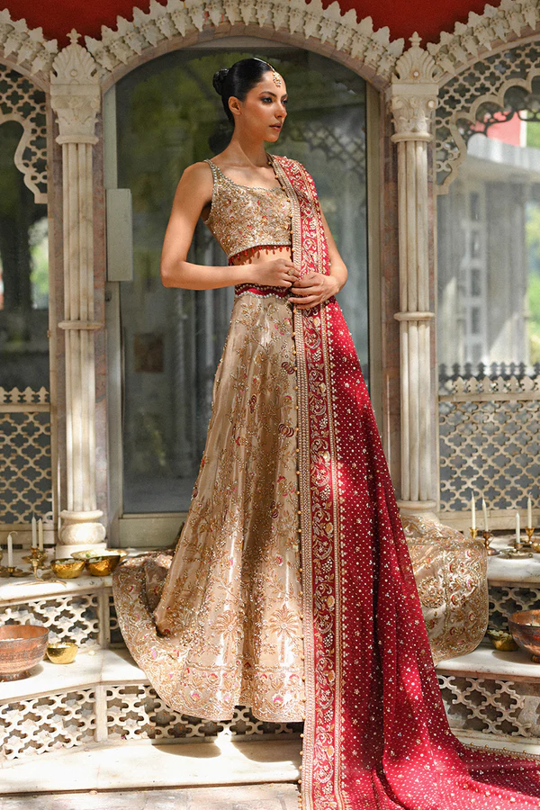 A gold tissue lehnga and choli features detailed zardoze and resham embroidery and is paired with a contrasting crimson cotton net dupatta adorned with gold zardoze borders and sequins.