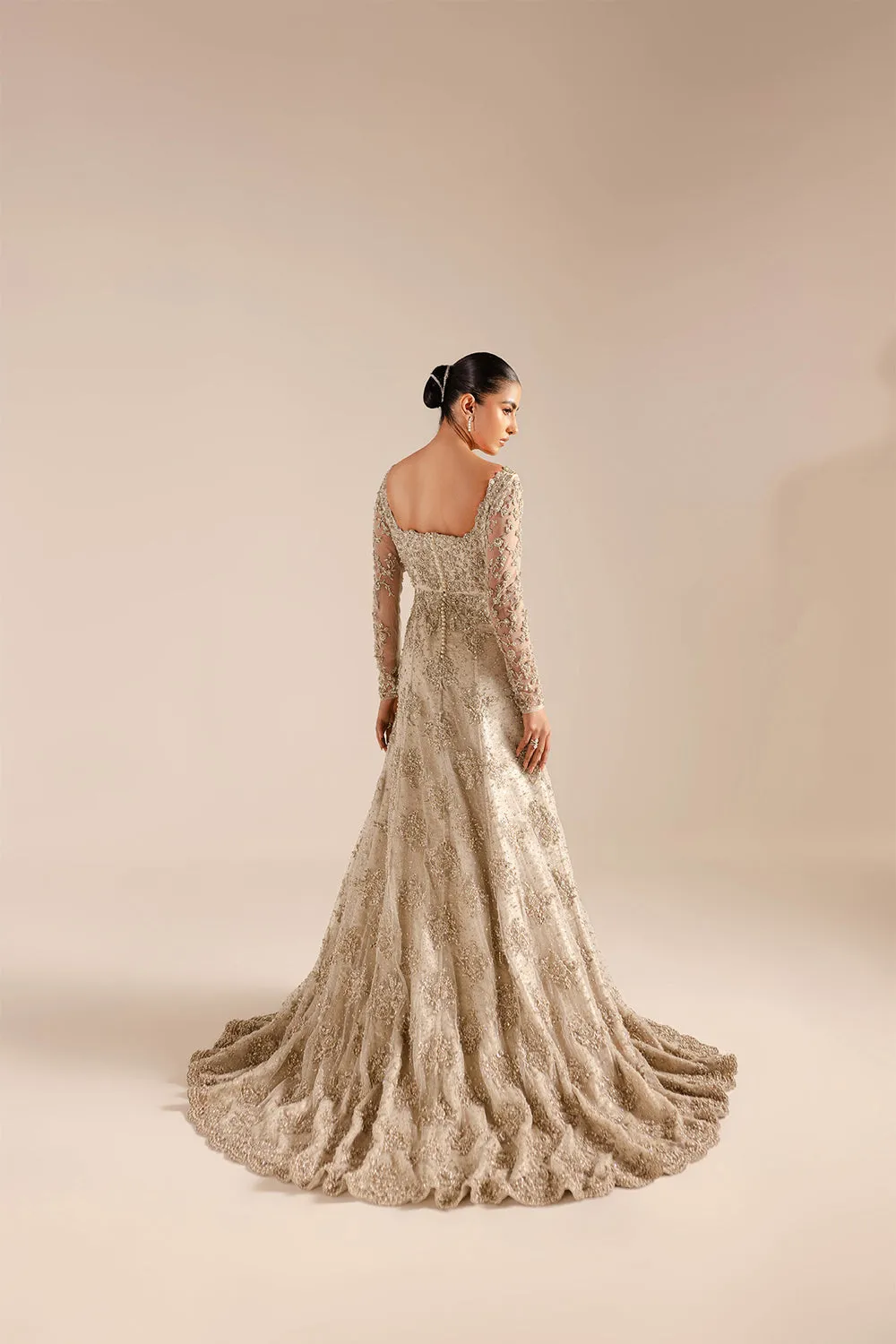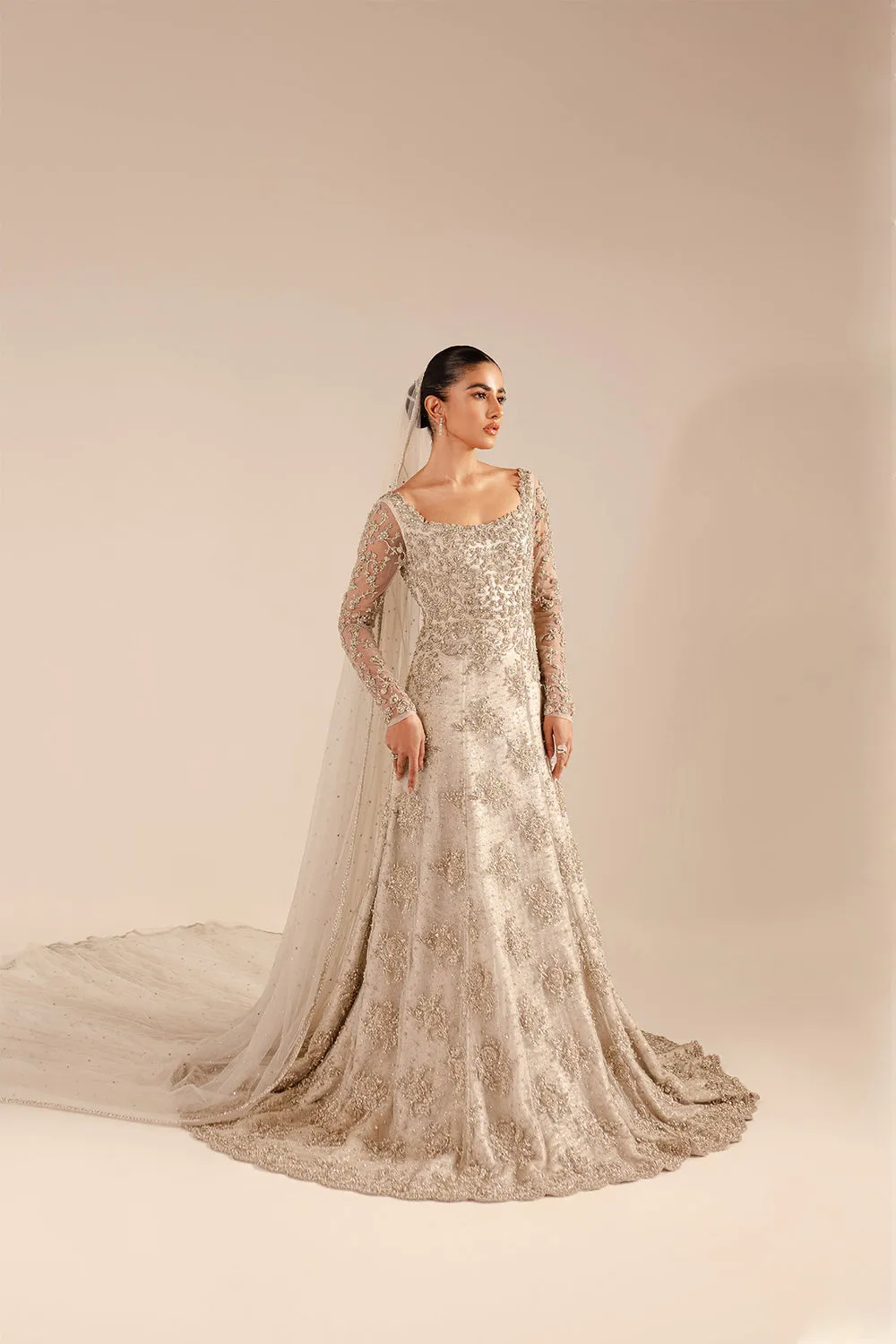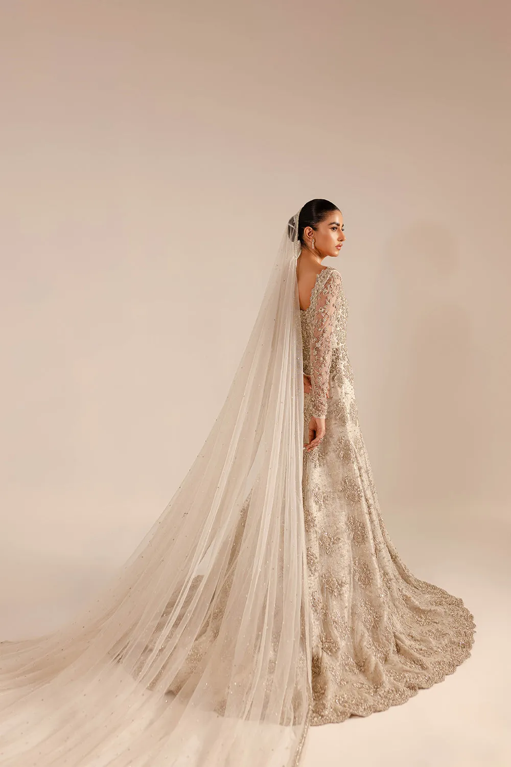 A full-length gown made of net, which is heavily embellished with zardozi, sequins, and crystal work. It features a bridal gown with a mermaid fit and train. This design is paired with a cathedral-style veil with a light border, along with heavy crystals and pearl spray in the middle.Gown: NetVeil: net